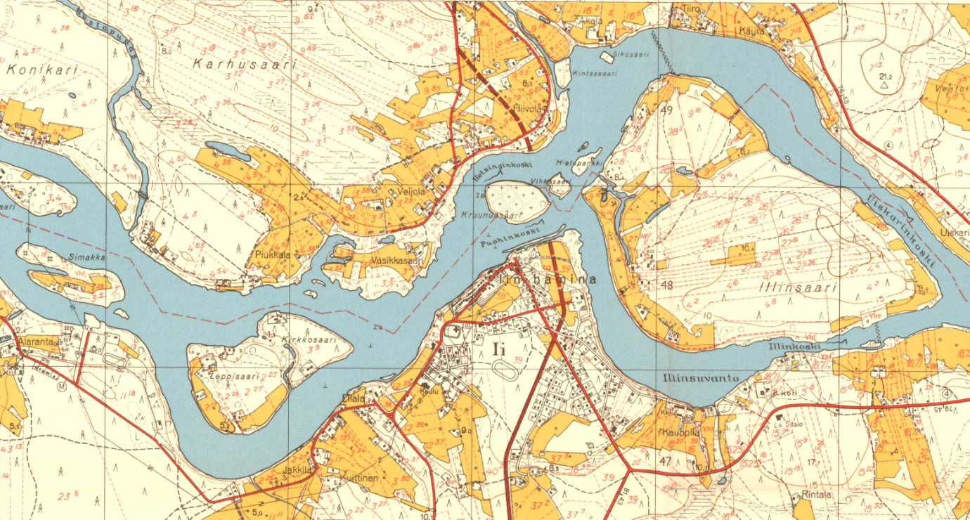 Oheisessa Maanmittauslaitoksen kartassa vuodelta 1952 näkyy hyvin Iin eri saaret, nykyinen kirkko ja entisen pappilan sijainti, kun vertaa sitä yllä olevaan vanhaan karttaan, joka on 1600- luvulta.