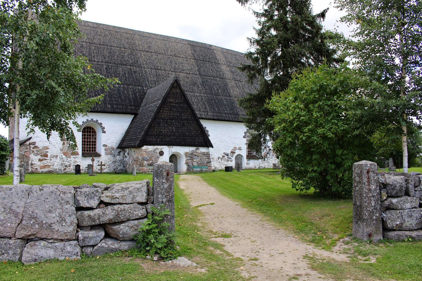 Kun astelin tuossa kuvassakin näkyvästä kivisen aidan portista kauniille kirkkopihalle, tuntui aivan oikeasti, että astelin esi-isäni jalanjäljillä. Minut valtasi sellainen omituinen tunne, että nykyhetki ja aika 500 vuotta sitten kohtasivat. Oli helppo kuvitella arkiset, vaatimattomat mutta elämäntahtoiset ihmiset kulkemassa sisään tuosta asehuoneen pienestä puuovesta.