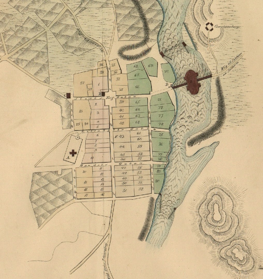Kajaanin kaupungin kartta 1840- luvulta (lähde:www.vanhakartta.fi). Toinen kvarttaali merkitty keltaisella.