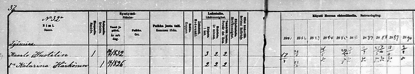Eskilin ja Stinan vanhin tytär Vilhelmina Helena s.25.7.1826 muuttaa 1849 Jyväskylään eikä hänen mahdollisista jälkeläisistään ole tällä hetkellä tietoa. Tyttäristä Caisa Sofia s.20.6.1830 kuolee reilun vuoden ikäisenä 15.11.1831. Lapsista seuraavaksi syntyy Carl 26.4.1832. Carl menee aikanaan naimisiin sotkamolaisen Catharina Henrikintytär Härkösen (s.16.1.1826) kanssa. Pariskunta oli ilmeisesti lapseton. Tutkimuksissa löytyy eräs mielenkiintoinen seikka tästä Carl Huotelista. Rippikirjoissa hänet on merkitty asumaan Kajaani 32:een eli samaan taloon kuin isänsä Eskil aikoinaan. Rippikirjoissa Carl mainitaan työmiehenä aina kuolemaansa saakka, kuten alla olevasta rippikirjaotteesta voi nähdä.