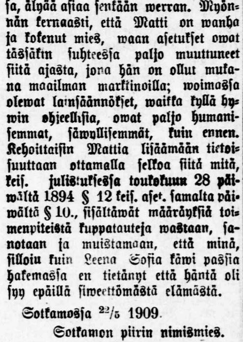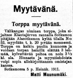 Lehtikirjoitukset saivat uteliaisuuteni heräämään. Mitä sitten tapahtui? Sotkamon rippikirjojen mukaan Leena Sofia oli poissa kotoaan Alasotkamon Välikankaan torpasta vuonna 1909 mutta eipä Mattikaan ole ripillä käynyt tuona vuonna. Vuonna 1910 molemmat ovat ripittäytyneet eli Leena Sofiakin on palannut kotiin. Tarina ei kuitenkaan pääty tähän. Toukokuussa 1911 Leena Sofia on laittanut lehteen ilmoituksen, jossa kieltää ketään ostamasta torppaa tai ryhtymästä muihinkaan kauppoihin miehensä Matti Maunumäen kanssa ilman Leena Sofian lupaa. Matti vastaa laittamalla heinäkuussa torpan myyntiin: