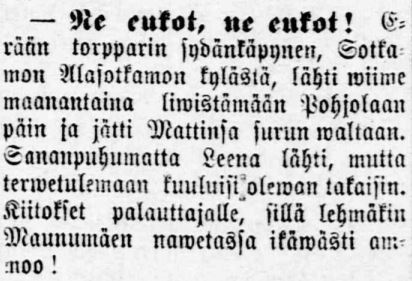 ”Ne eukot, ne eukot! Erään torpparin sydänkäpynen, Sotkamon Alasotkamon kylästä, lähti viime maanantaina livistämään Pohjolaan päin ja jätti Mattinsa surun valtaan. Sananpuhumatta Leena lähti, mutta tervetulemaan kuuluisi olevan takaisin. Kiitokset palauttajalle, sillä lehmäkin Maunumäen navetassa ikävästi ammoo!”