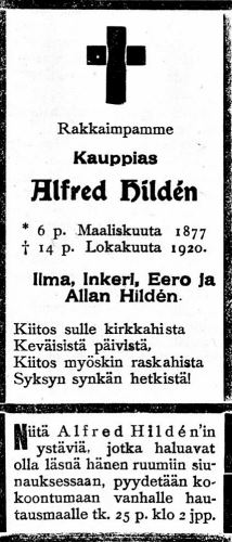 Tällaista oli siis oikeudenkäynti sata vuotta sitten. Artikkelin teksti on kerätty kymmenistä asiaa käsittelevistä lehtijutuista ja olen yrittänyt olla muuttamatta alkuperäistä tekstiä liikaa, siksi teksti on osittain vanhahtavaa eikä niin sujuvaa. Artikkelin otsikon maininta Enberg-Koskisesta on tavallaan harhaanjohtava, koska kyseinen etsivätoimisto ei oikeastaan osallistunut asiaan muuten, kuin saamalla paikalliset virkamiehet edes jotenkin kiinnostumaan asiasta. Minä kiinnostuin kauppias Hildénin tapauksesta siksi, että kokonaisen oikeuskäsittelyn seikkaperäinen selostus sanomalehdissä salli sisäisen sherlockholmesini pohtia tapahtumien kulkua, motiivia ja päätöstä pala kerrallaan. En tosin pysty pelkkien lehtikirjoitusten, vaikka ne ovatkin varsin yksityiskohtaisia ja noudattavat tarkkaan oikeudessa tapahtunutta, sanomaan mitä oikeasti tapahtui 14.-15. lokakuuta 1921. Kuoliko kauppias Hildén onnettoman tapaturman seurauksena hukkumalla vai tapahtuiko se vahinko Wilmille ja hän surmasi Hildénin, kuten korkein oikeus asian näki? Asian tiesivät vain Wilmi ja Häyrinen. Pahoittelen, että artikkelista tuli näin pitkä mutta oli mahdotonta karsia asioita jättämättä mitään olennaista pois. Jos osaisin, olisin kirjoittanut tapahtuman minidekkarina mutta kun en osaa, en edes yritä. Tähän tarinaan en ole kaivanut perhetietoja Hildénien enkä tuomittujen osalta, enkä myöskään tuomittujen elämien myöhempiä vaiheita. Tapaus itsessään oli se tärkein tällä kertaa.
