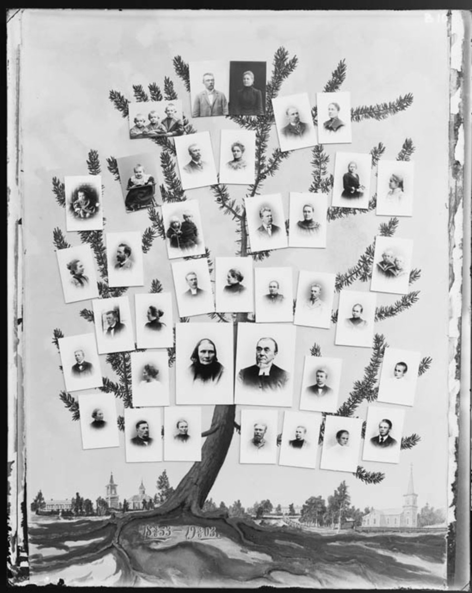 Castrénien suvun Kainuuseen toi Matthias Castrenius. Hänen ja jälkeläistensä tarinan olen jo melko tarkkaan kirjoittanut Kajaanin Pormestareista kertovaan artikkeliini. Matthias Castrenius tuli Kajaanin v.t. kruununvoudiksi vuonna 1725 ja nimitettiin Kajaanin pormestariksi kolme vuotta myöhemmin. Matthias oli kulkenut kiemuraisen polun Kajaaniin mutta suvun lähtökoti on Sääksmäen Linnaisten Mattila-niminen ratsutila. Matthiaksen isä Olof syntyi siellä vuonna 1666 ratsutilallisen Krister Grelssonin ja vaimonsa Gertrudin perheeseen. Olofista tuli ensin kappalainen ja myöhemmin Pälkäneen kirkkoherra. Länsi-suomalaiseen tapaan sukunimiä ei juurikaan tavallisen kansan keskuudessa käytetty ja kun Olof siirtyi pappissäätyyn piti hänelle keksiä jostain sukunimen korvike, jolla hänet voitiin erottaa muista Olof Kristerinpojista. Kotitalo Mattilan nimi oli ehkä liian tavallinen tai liian suomalainen ylempään säätyy, joten ilmeisesti kotikylänsä Linnaisten mukaan hänelle annettiin linna-sanasta latinalaistettu (castrum) maskuliinimuoto Castrenius. Castrenius muoto lyheni jo Matthiaksella muotoon Castreen ja hänen pojillaan muotoon Castrén. Castrénien suvun virka- ja pappismiehet vaikuttivat Kainuussa 1720-luvulta aina 1800-luvun lopulle saakka. Yllä olevan sukutaulun kovakollaasin keskiössä on Hyrynsalmen ja Pielisjärven kirkkoherra Jonas Kristian Castrén puolisonsa Vilhelmina Ingeborg Qvickströmin kanssa. Taulu lienee pariskunnan 50-vuotis häälahja. Jonas Kristian oli Kajaanin pormestarina toimineen Christer Matthiaksenpoika Castrénin jälkeläinen kolmannessa polvessa.
