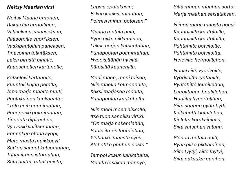 Joululaulut olivat osa joulunviettoa jo keskiajalla mutta perinteiset kristilliset latinankieliset laulut laulettiin vain suurimmissa kirkoissa ja katedraaleissa. Kyllä tavallinen kansakin laulaa osasi ja riimitellä runoja. Aiheet voitiin hyvinkin ottaa niistä kristillisistä opeista, joita oli sattunut kuulemaan ja ymmärtämään. Kansansuussa tarinat vain eivät ehkä lopulta olleet ihan samansisältöiset kuin raamatussa. Tässä esimerkkinä alku Neitsyt Marian virrestä, muinaisrunolaulusta, jossa Maria tulee raskaaksi syötyään puolukan. Teksti on vanhaa murteista suomenkieltä, joten sanat kannattaa tavata rauhassa, jotta ne aukenevat. Eli ei ollut kärmes syntiin houkuttelemassa Mariaa vaan puolukka. Laitoin linkin koko runolauluun artikkelin loppuun.